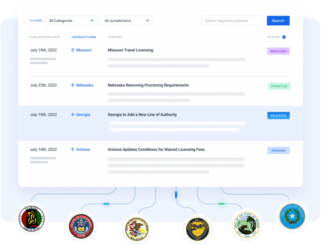 Insurance is mostly regulated on a state-by-state basis, with each state and U.S. territory determining their own legal standards and procedures. Here you can find state-specific information such as department of insurance contacts; read FAQs about licensing, carrier appointments, and Just-In-Time requirements; and stay up to date with relevant articles and blogs.