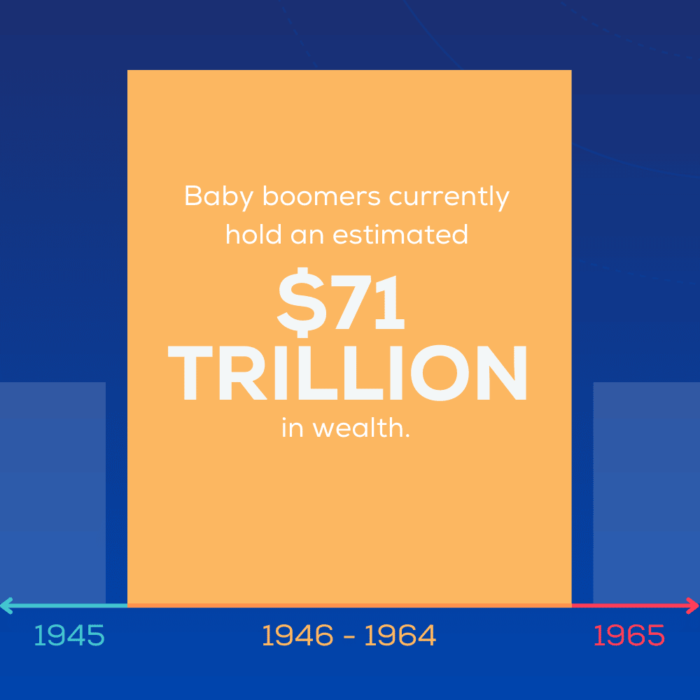 The state of American economics since World War II, including low interest rates, a thriving stock market, and an inflated real estate market, has made the baby boomer generation the wealthiest to ever exist in the U.S. Baby boomers, defined as those born between 1946 and 1964, currently hold an estimated $71 trillion in wealth. This means they’re an astonishing eight times as wealthy as millennials, and also hold almost double the wealth of the entire Gen-X population.