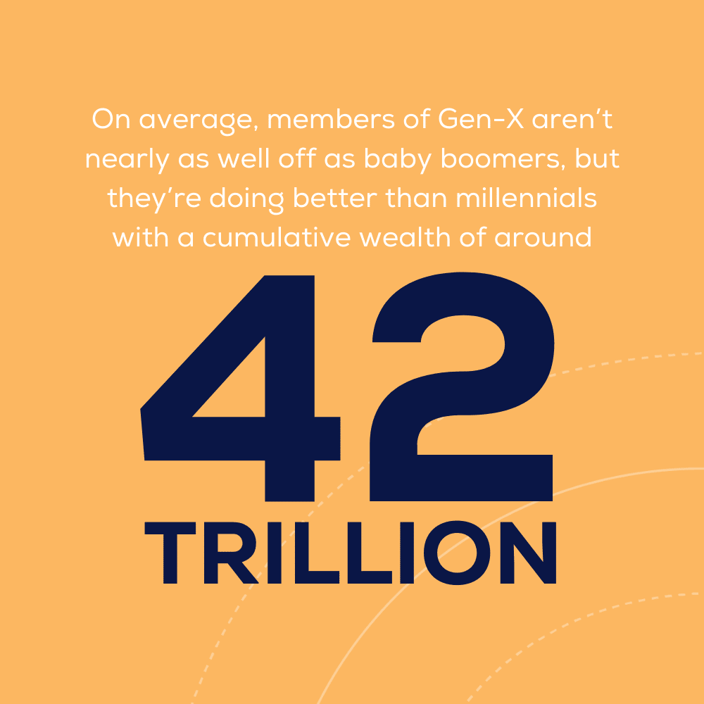 Generation-X stands to gain a lot in The Great Wealth Transfer as many of them are the children of baby boomers who can almost see their inheritance right around the corner. On average, members of Gen-X aren’t nearly as well off as baby boomers, but they’re doing better than millennials with a cumulative wealth of around $42 trillion. That’s more than 50 percent the worth of the boomer generation, and still almost five times as much as what millennials have accrued.