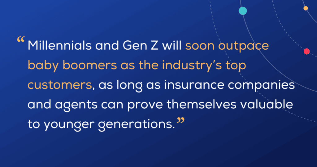 All in all, baby boomers are a highly-insured population, who’ve helped the insurance industry thrive over the past 50 years. A study by Deloitte Consulting calls boomers “historically the most reliable customer base” for insurance, particularly life insurance. But, the study notes, this is changing. Millennials and Gen Z will soon outpace baby boomers as the industry’s top customers, as long as insurance companies and agents can prove themselves valuable to younger generations.