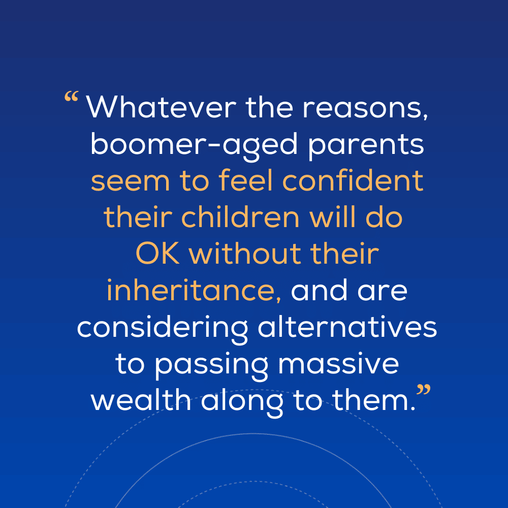 There are a variety of reasons behind this shift in mentality, from motivating their own children to go out and build wealth for themselves to intentionally denying funds to their purportedly “entitled” millennial children. Whatever the reasons, boomer-aged parents seem to feel confident their children will do OK without their inheritance, and are considering alternatives to passing massive wealth along to them.