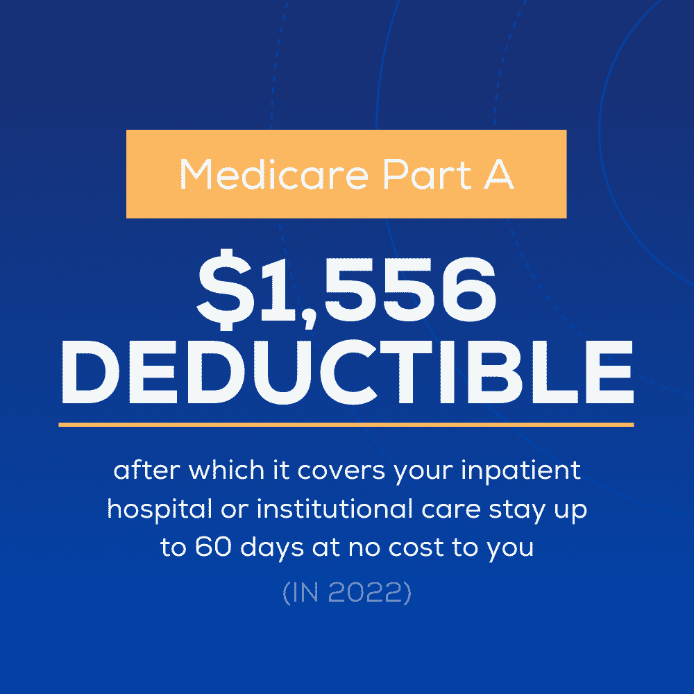 Medicare Part A: Part A is hospital insurance. This is part of “Original Medicare,” and generally doesn’t require a premium payment. Part A has a deductible – $1,556 in 2022 – after which it covers your inpatient hospital or institutional care stay up to 60 days at no cost to you. After 60 days, Medicare requires you to pay daily co-insurance. After 150 days of inpatient care, Medicare will no longer cover a continuous care stay as it deems you will have moved on to a long-term care scenario beyond the scope of Medicare coverage.