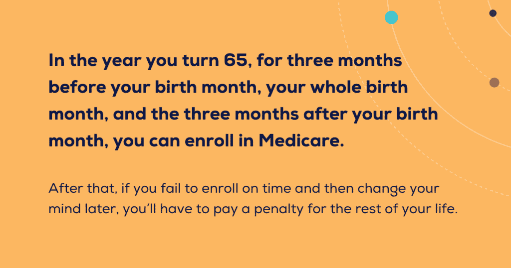 In the year you turn 65, for three months before your birth month, your whole birth month, and the three months after your birth month, you can enroll in Medicare. After that, if you fail to enroll on time and then change your mind later, you’ll have to pay a penalty for the rest of your life.