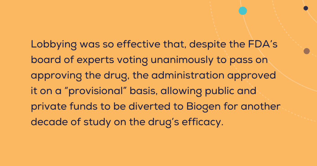 In fact, lobbying was so effective that, despite the FDA’s board of experts voting unanimously to pass on approving the drug, the administration approved it on a “provisional” basis, allowing public and private funds to be diverted to Biogen for another decade of study on the drug’s efficacy.